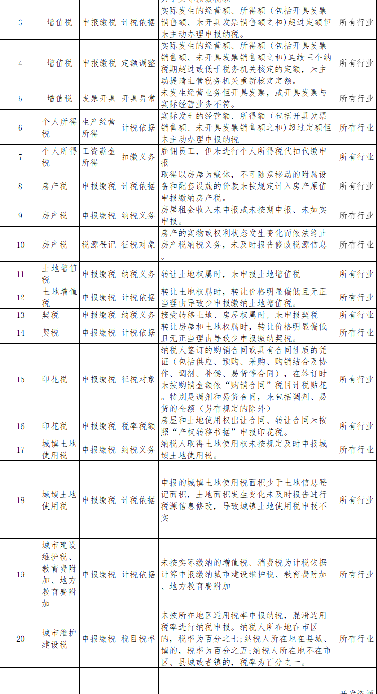 其中《定期定额个体工商户风险提示清单》提示风险23个,《查账征收小规模纳税人风险提示清单》提示风险70个,《增值税一般纳税人风险提示清单》提示风险80个;涉及的税种主要包括:增值税、企业所得税和个人所得税以及土地增值税;涉及的风险要素主要包括:计税依据、征税对象、纳税义务、减免核准、扣除费用、纳税地点等等。