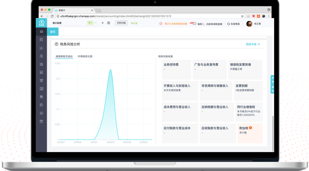 假如是生产型企业,当公司有产量和销量的时候,通常会产生一定金额的水电费、运费等等,如果你销售不开票,你的纳税和销售收入的金额与公司的成本费用金额将不成正比;又或者你是其他类型的企业,你公司的员工数量、员工工资等情况与公司的销售收入相比,也会显得异常。因此建议可以使用畅捷通好会计的“税务风险检查”功能,可在短短几秒内测算企业多种预警指标,方便财务或老板及时发现风险指向,及时查明问题,在报税期之前应对风险。